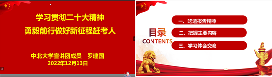 宣讲最后罗建国结合党的二十大报告中关于青年的重要论述,号召全院师生,以党的二十大精神为引领,坚定不移听党话、跟党走。