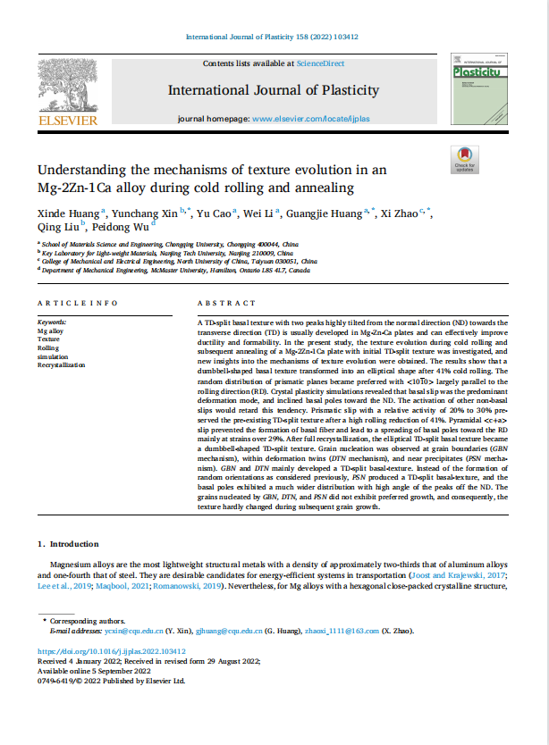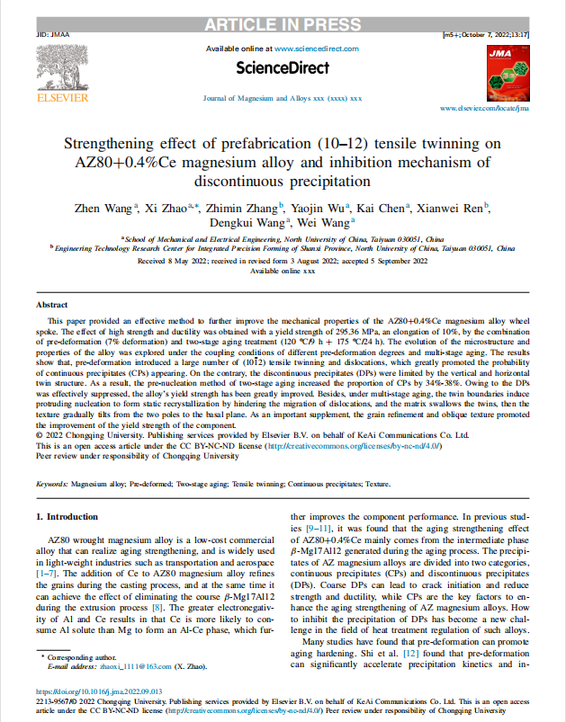在中北大学A类学科建设项目资助下,赵熹教授团队连续发表顶刊。其中题为“ Understanding the mechanisms of texture evolution in an Mg-2Zn-1Ca alloy during cold rolling and annealing”发表在塑性力学国际顶刊“International Journal of Plasticity”,系中北大学首次在该期刊发表,2022年影响因子8.5,中科院大类1区。题为“Strengthening Effect of Prefabrication (10-12) Tensile Twinning on AZ80+0.4%Ce Magnesium Alloy and Inhibition Mechanism of Disontinuous Precipitation ”发表在国内(国际)顶刊“Journal of Magnesium and Alloys”;期刊2022年影响因子11.813,中科院大类1区,位列全球冶金与冶金工程类期刊榜首,入选“中国科技期刊卓越行动计划”领军期刊。