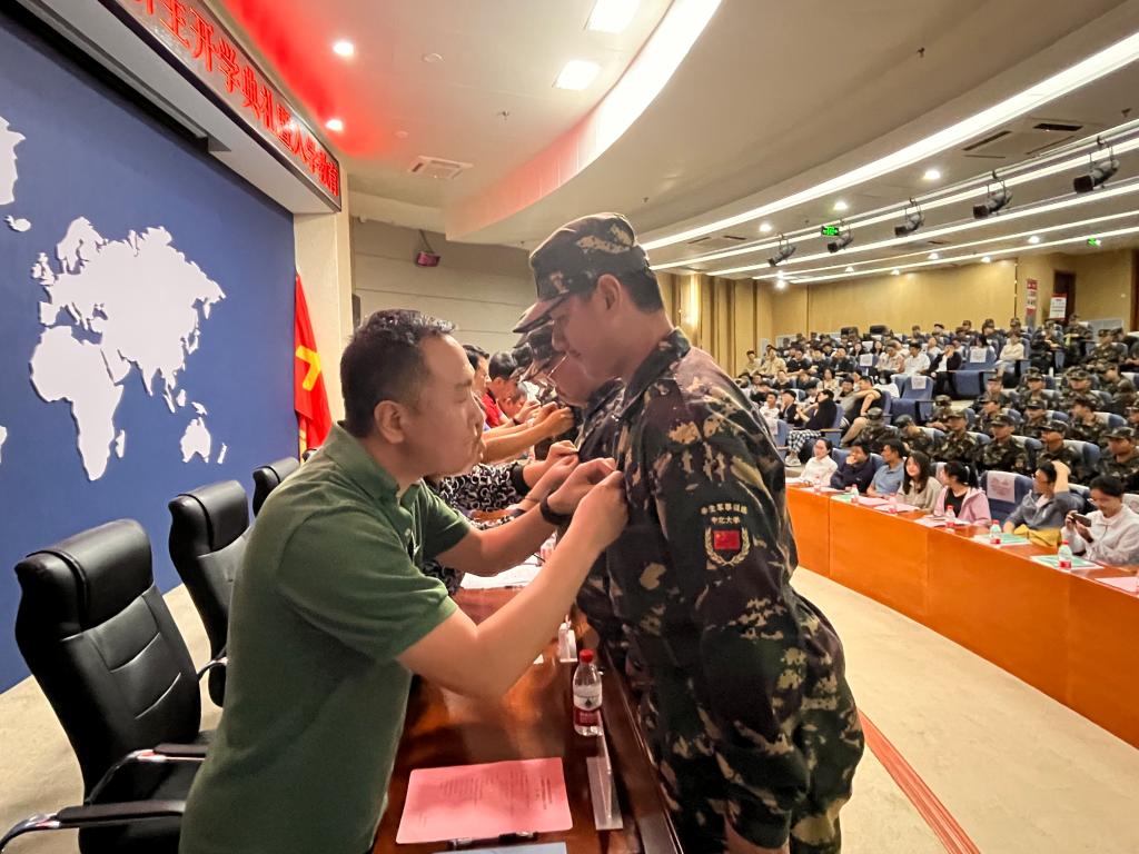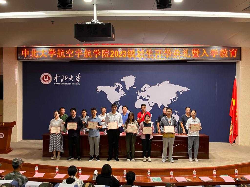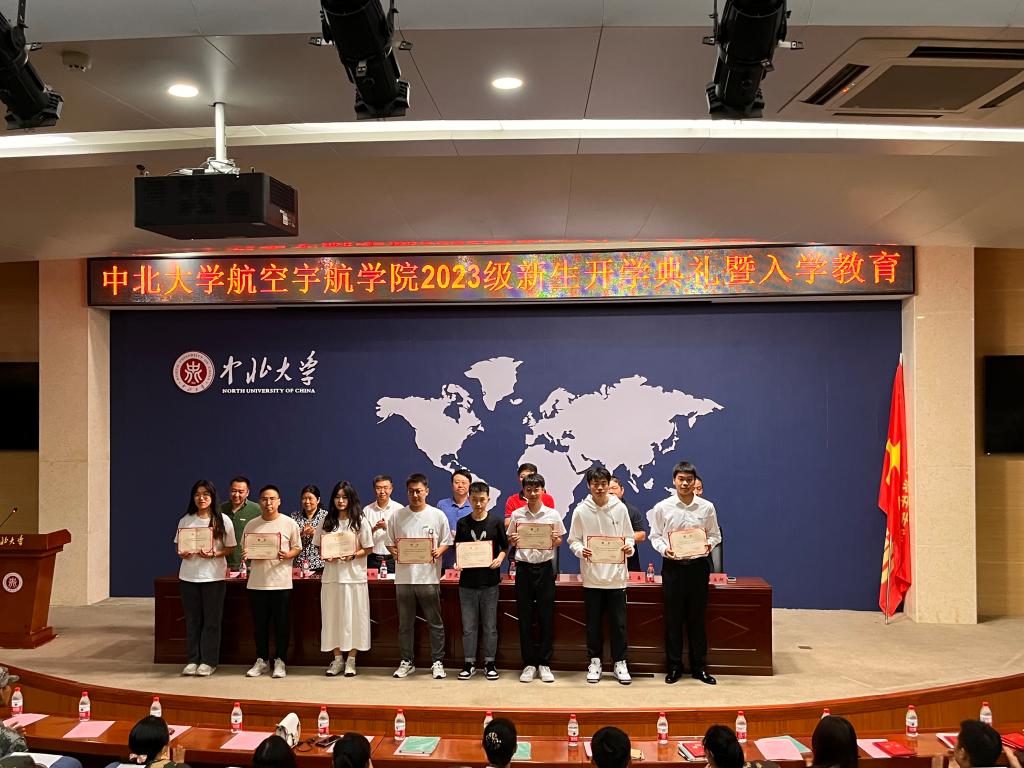 校徽佩戴仪式中,主席台就座人员为新生代表们佩戴校徽,校徽承载着中北人的光荣与使命,“中北大学”四个字将成为大家一生的印记,也将见证新一代中北航院人逐梦新程、奋进未来。