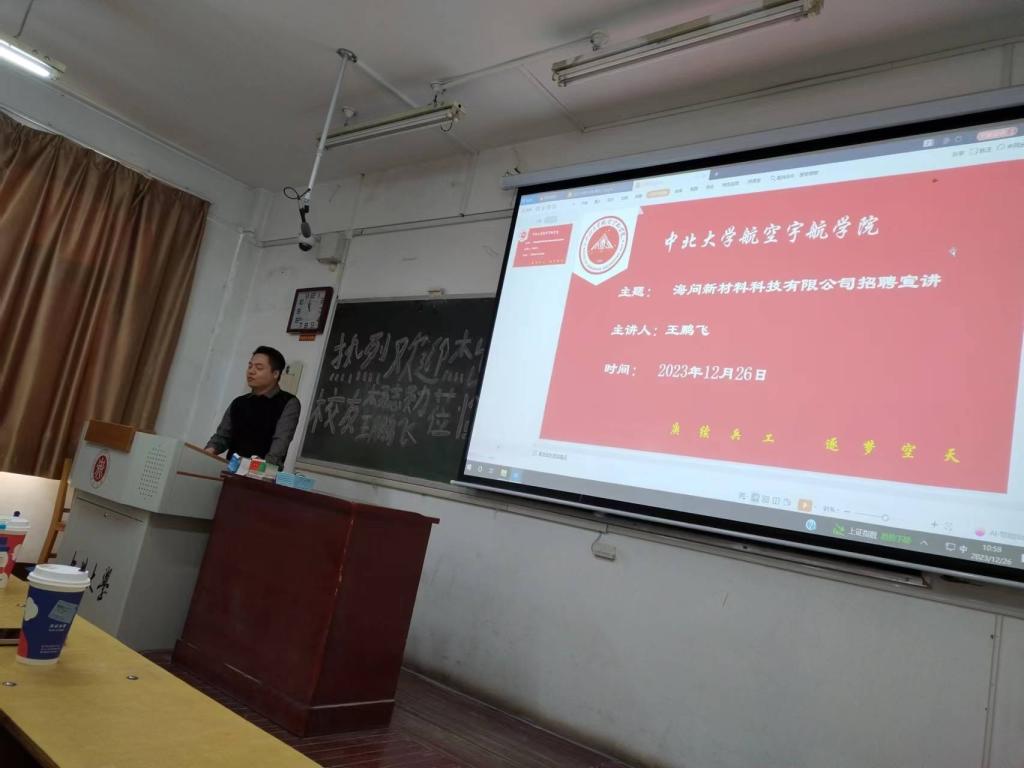 王鹏飞校友于2009年毕业于中北大学工程力学专业,现为海问新材料科技有限公司董事长,他首先提出“学习力学知识,懂得其思想才是关键”。然后向大家全方位介绍了公司目前发展现状,展示了公司优秀的研发团队和突出的研发成果,公司为力学、机械、材料专业本硕同学提供多个就业岗位,在座同学们就自己关心的问题进行了现场咨询。