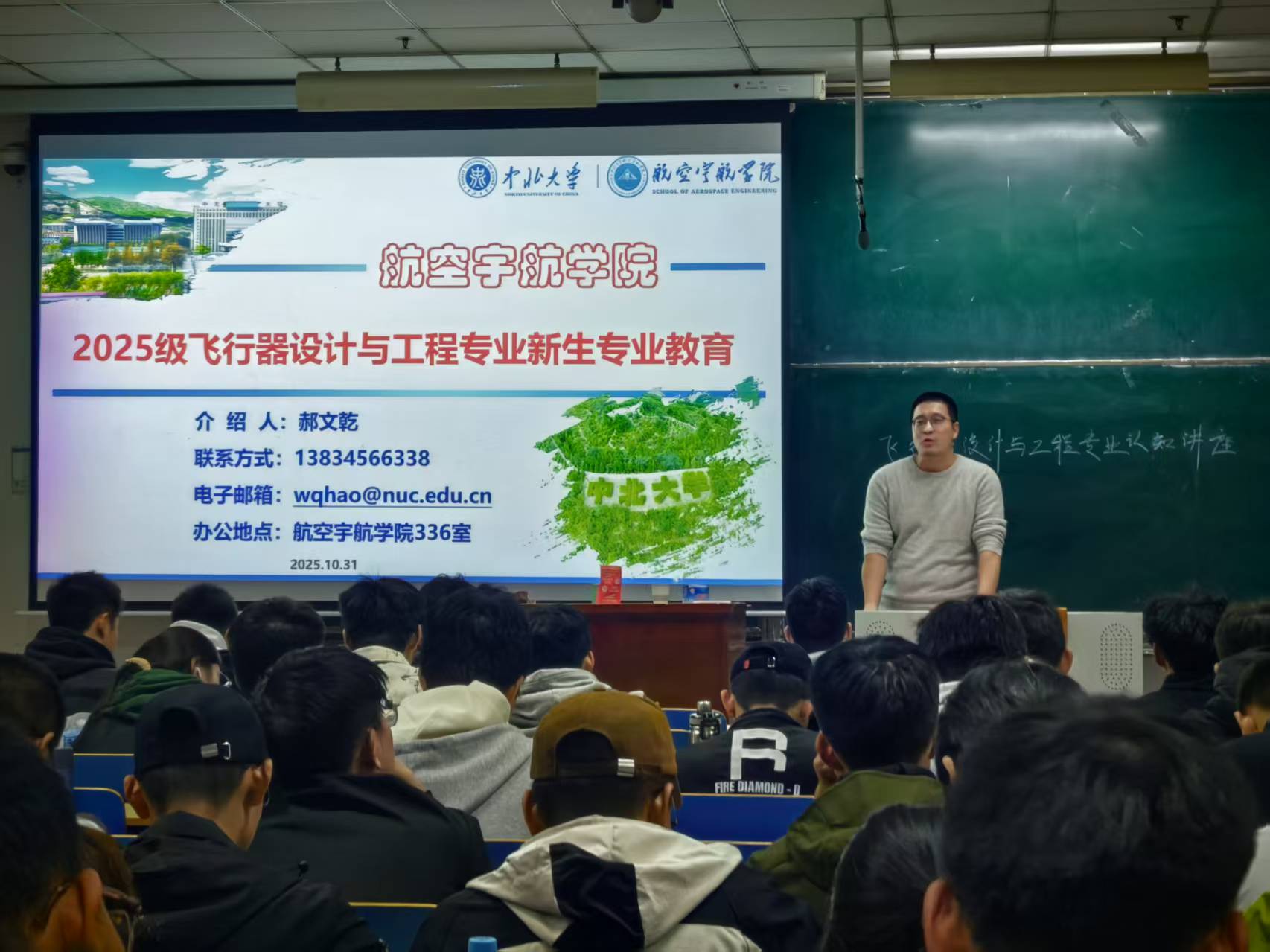 为深化新生对飞行器设计与工程专业的系统认识,明确学习目标与发展方向,10月31日,飞行器设计与工程专业在11112H教室举办了2025级新生专业认知讲座。本次讲座特邀学科负责人郝文乾老师担任主讲,全体2025级飞行器设计与工程专业学生参加。