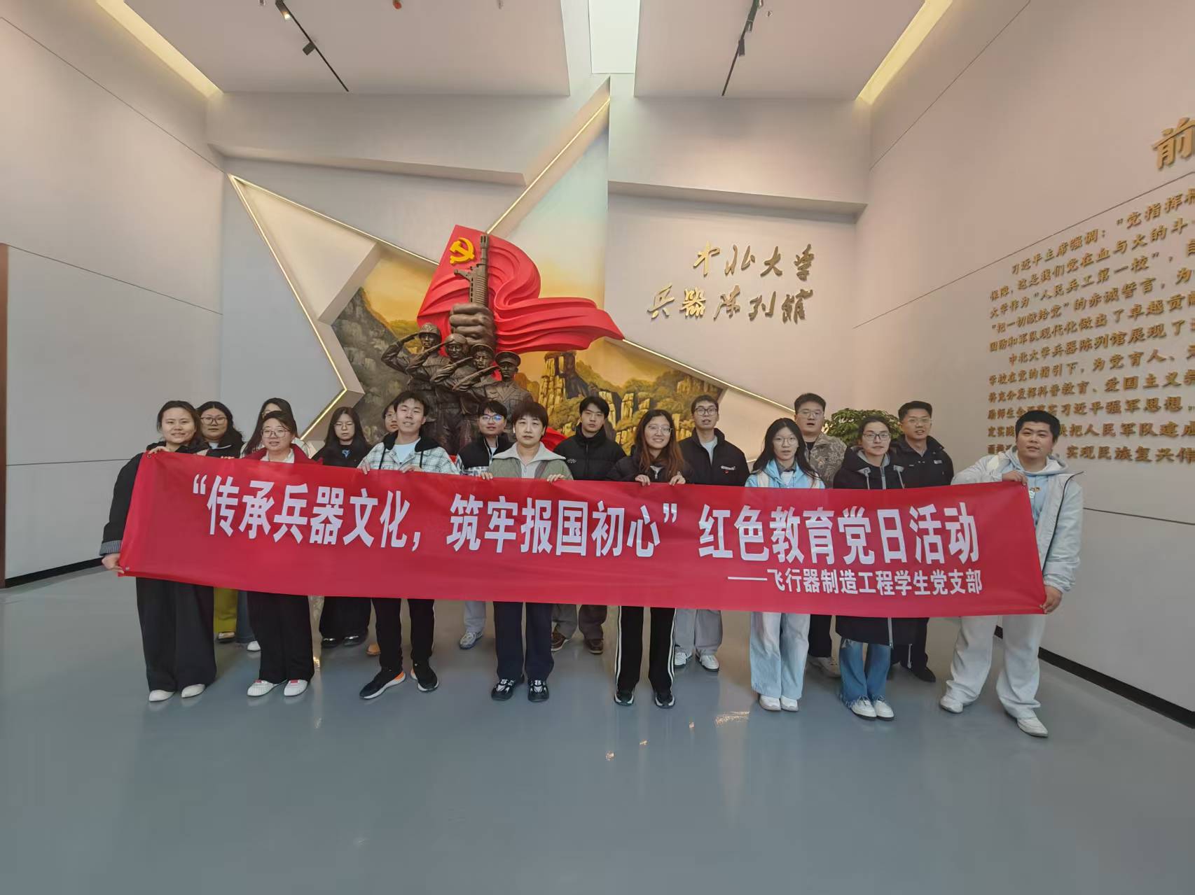 为深化国防教育、传承军工精神,11月21日,飞行器制造工程学生党支部组织全体党员走进中北大学兵器陈列馆,在讲解员的全程导览下,循着馆内兵器展品的脉络,重温烽火岁月里的军工担当。此次活动旨在通过实地参观学习,增强支部成员对国防建设重要性的认识,传承和弘扬军工精神。