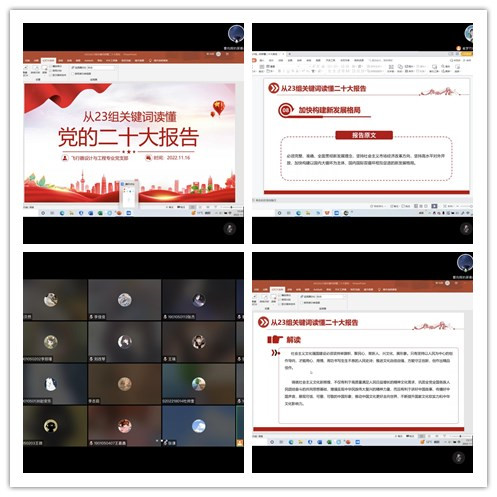 党的二十大是在全党全国各族人民迈上全面建设社会主义现代化国家新征程、向第二个百年奋斗目标进军的关键时刻召开的一次十分重要的大会。为使同学们及时、全面地了解和学习大会精神,飞行器设计与工程学生党支部于2022年11月16日,通过腾讯会议开展了主题为学习党的二十大会议精神的支部会议。