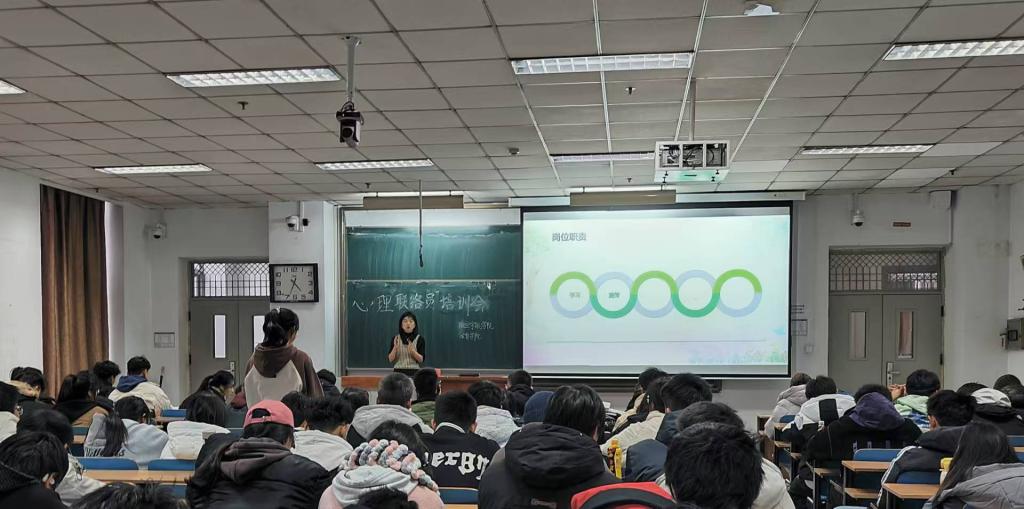 于2024年11月26日下午4:00在11105H教室举办新生心理骨干技能培训会。本次会议由学院辅导员段雪倩主持,学校大学生心理健康教育中心主任高林老师担任培训主讲,学院2024级全体班级心理联络员、宿舍长积极参加。